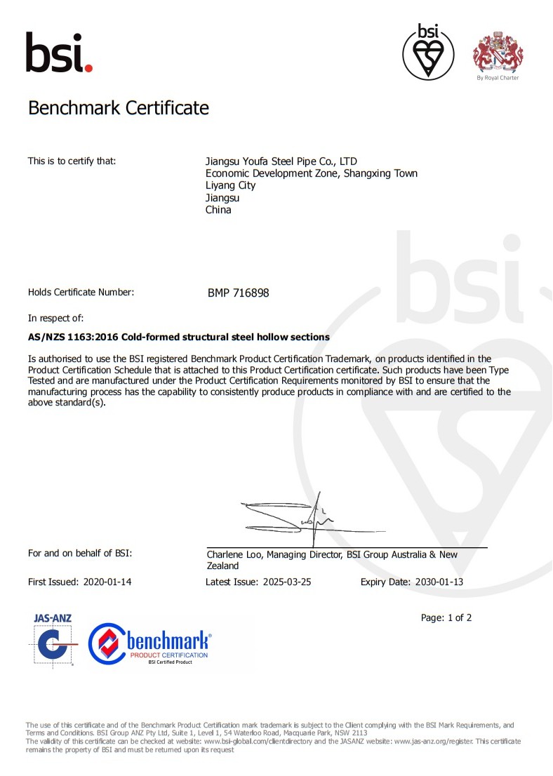 Youfa owning BSI certification signifies that Youfa brand square and rectangular hollow sections comply with the international standard AS/NZS1163, which helps enhance the trust of customers who have a demand for Australian standard steel pipes.